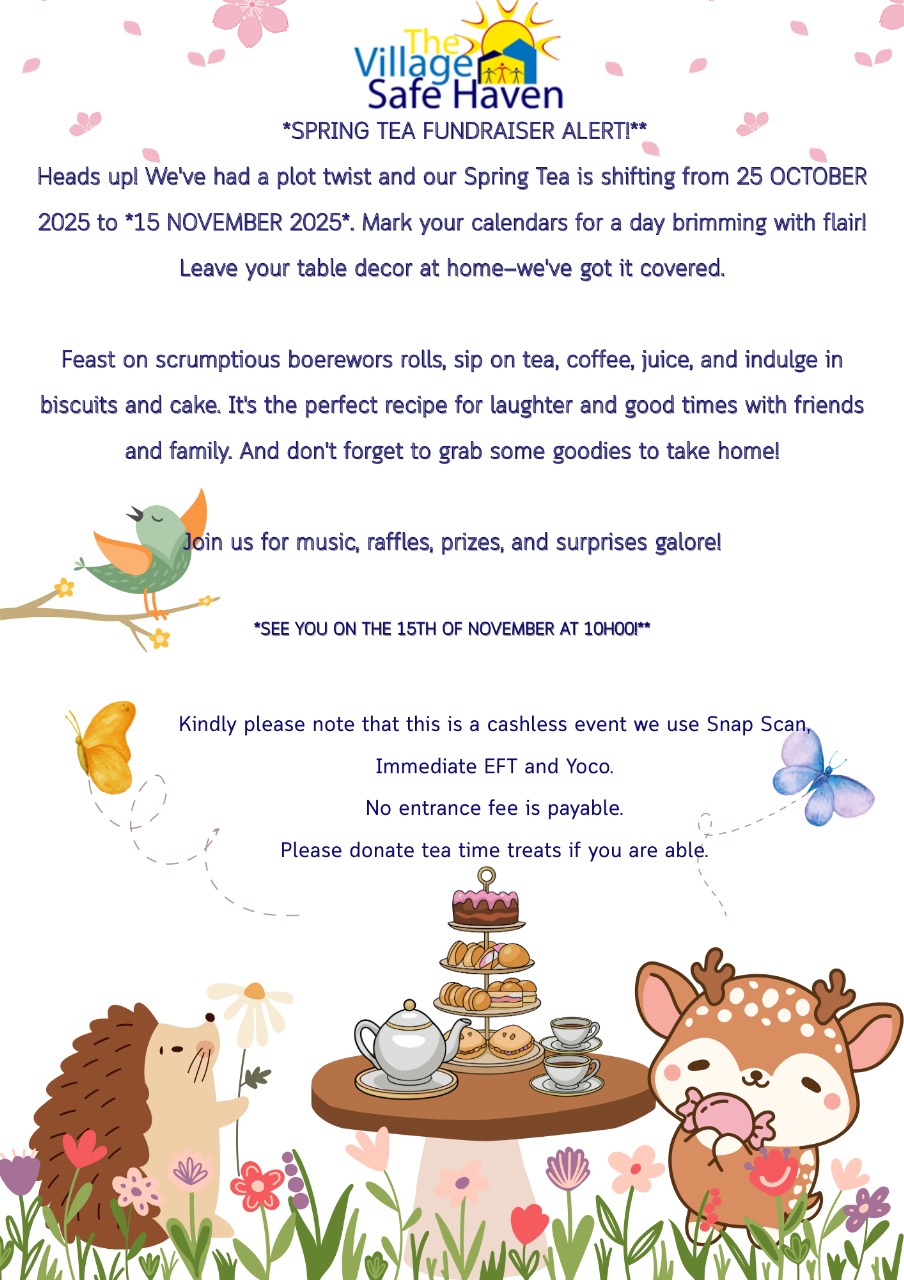 Our beautiful Spring Tea has opened for bookings. We have had to reschedule to 15 November 2025 10h30 to 13h00. Food and drinks will be on sale for the day. No need to decorate your table. We have it covered this year. Please WhatsApp or email Sue to book your seats.